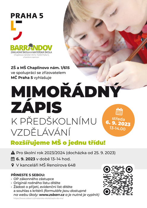 přes léto jsme rozšířili Mateřskou školu na Chaplinově náměstí o jednu novou třídu a proto vyhlašuje ředitelka školy mimořádný zápis. Zápis bude probíhat v budově MŠ Renoirova (Renoirova 648/29) ve středu 6.9. 2023, 13 – 14 hod.