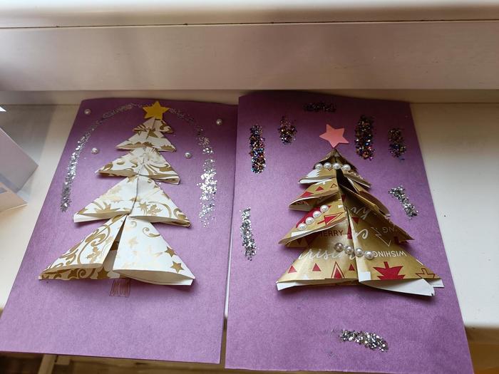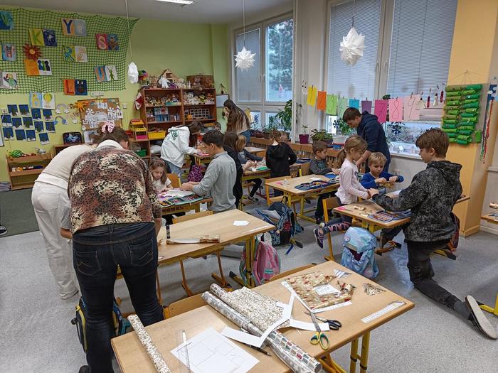 Žáci se tak společně naučili, jak se dělají krásná vánoční přáníčka a třídní učitelka třídy 1. B paní Ulčáková na tvorbu tolika přáníček jistě pomocné síly uvítala.