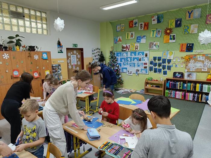 Těsně před Vánoci se zastavili žáci z 8.A u svých malých kamarádů z 1.B, aby spolu vytvořili vánoční přáníčka. Osmáci jsou už naštěstí dost zruční, a zvládli tak prvňáčkům se vším pomoci. Prvňáčci ale ukázali, jak dobře už umí stříhat, obkreslovat, skládat papír a zdobit.