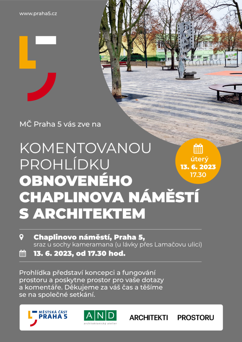 Komentovaná prohlídka revitalizovaného Chaplinova náměstí proběhne v úterý 13.6.2022 v 17:30. Prohlídka představí koncepci a fungování prostoru a poskytne prostor pro vaše dotazy a komentáře. Děkujeme za váš čas a těšíme se na společné setkání.