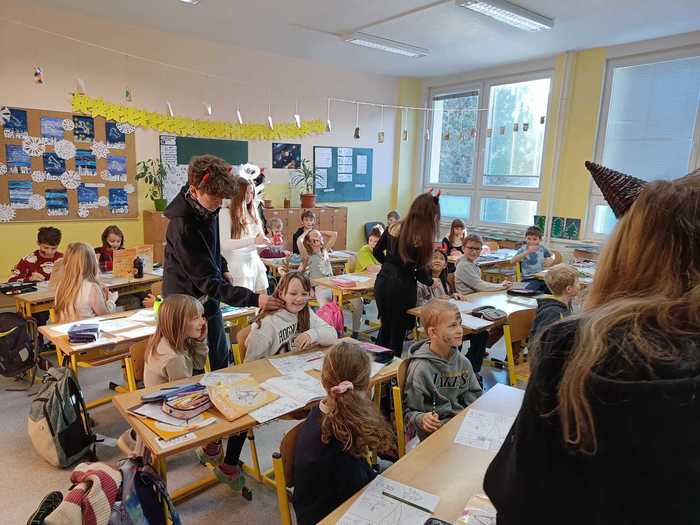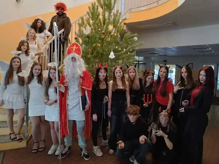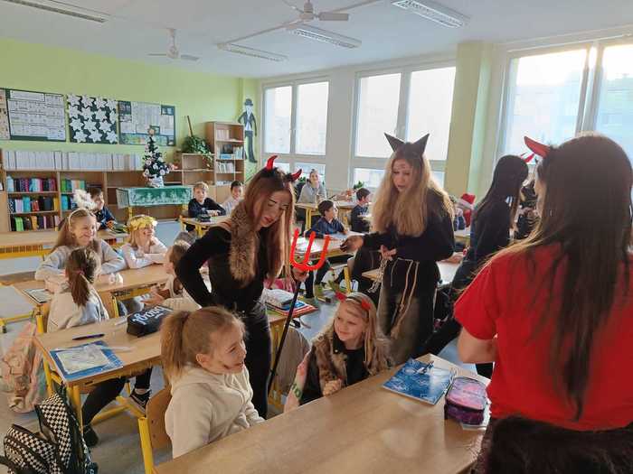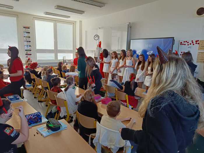 Aby ale o návštěvu nebyli ochuzeni ani žáci třetích a čtvrtých tříd, tak se za čerty a anděly převlékli vybraní žáci devátých tříd. Ti řádili po chodbách v průběhu dopoledne a využili tak příležitosti k postupnému loučení se školou i mladšími spolužáky. Aby nikomu v nadcházejícím období nechyběly vitamíny, tak k obědu všichni dostali k Mikuláši mandarinky.