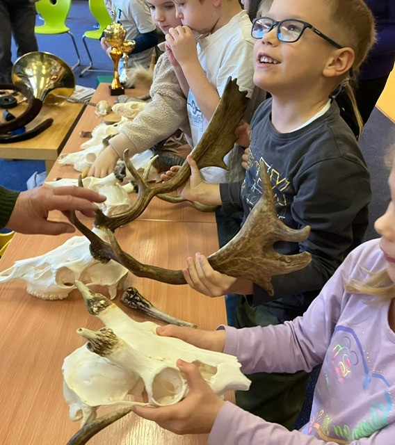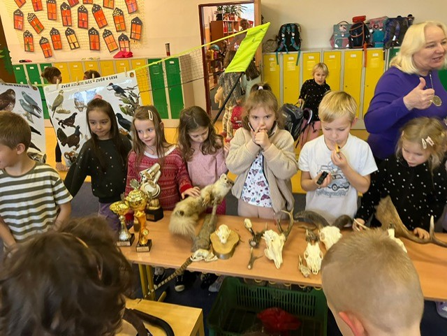 Dne 27.11.2024 zavítali mezi prvňáčky ze školní družiny dva zkušení myslivci z honitby nad soutokem Labe a Vltavy nedaleko města Mělník, aby jim mohli vyprávět o lese, lesních obyvatelích i o své práci.