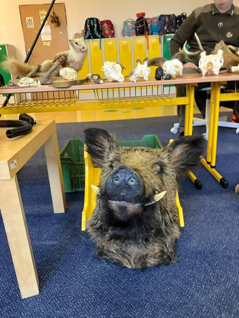 Děti odcházely plné dojmů a mnohé si ještě pohladily velkou chlupatou kančí hlavu a potěšily pohledem na početné barevné obrázky, plakáty, různé myslivecké rekvizity a trofeje.