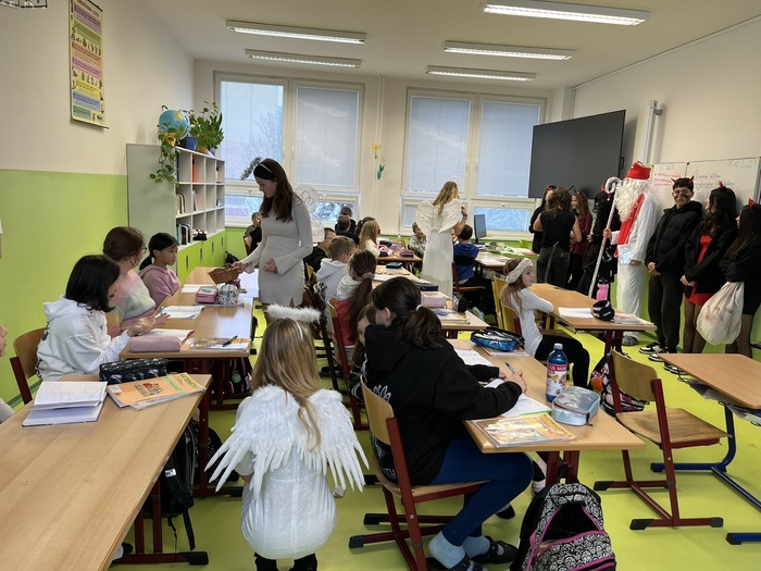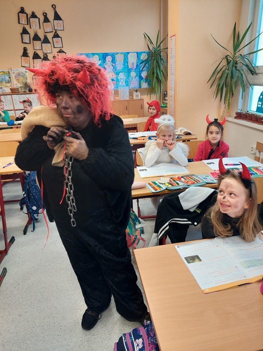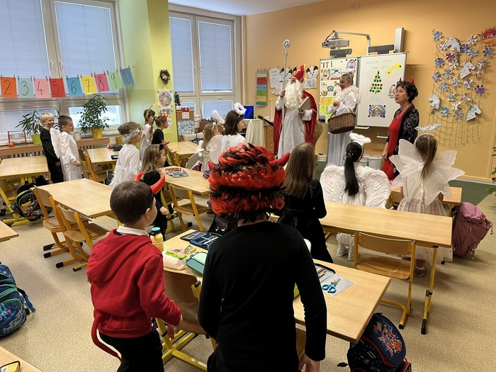 V úterý 5. prosince navštívil třídy na 1. stupni Mikuláš v doprovodu čertů a andělů. Mikulášů se u nás ve škole sešlo hned několik. Jeden jediný by zkrátka na návštěvu tolika dětí nestačil. Se zazvoněním usedly děti do lavic a napjatě očekávaly, kdy do třídy vstoupí tato vzácná návštěva...