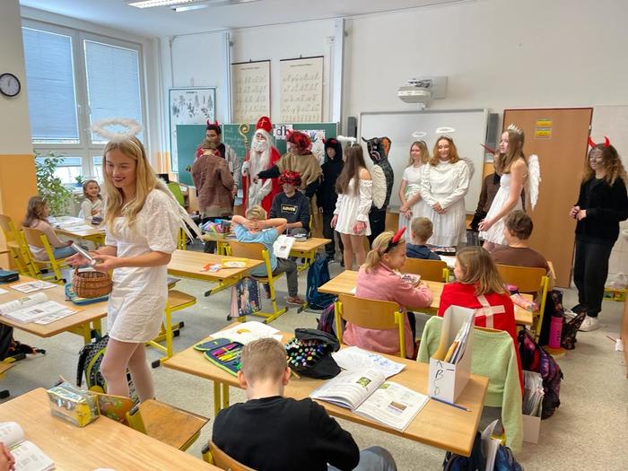 Všechny děti se návštěvy dočkaly. Čerti vběhli do třídy a pozlobili žáky i paní učitelky. Na vše naštěstí dohlíželi milí andělé s Mikulášem, ti neposedné čerty srovnali do latě. Mikuláš promluvil k dětem, pochválil hodné a vyptával se na „zlobivce“… Někteří „zlobivci“ se hrdě hlásili, jiní ani nedutali. Vše ale dobře dopadlo – všichni Mikulášovi slíbili, že se polepší. Nakonec každá třída pak Mikulášovi a jeho družině zazpívala písničku, nebo odrecitovala básničku. A to si rozhodně zasloužilo odměnu v podobě drobné sladkosti.