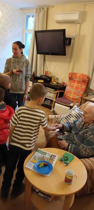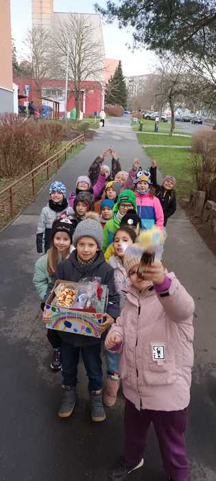 Do stacionáře Gloria na Barrandově jsme se skupinkou prvňáčků došli a zdejším klientům popřáli hezké Vánoce osobně. Společně jsme si zazpívali známé dětské písničky a vánoční koledy, předali dárky a ozdobili stromy na zahradě.