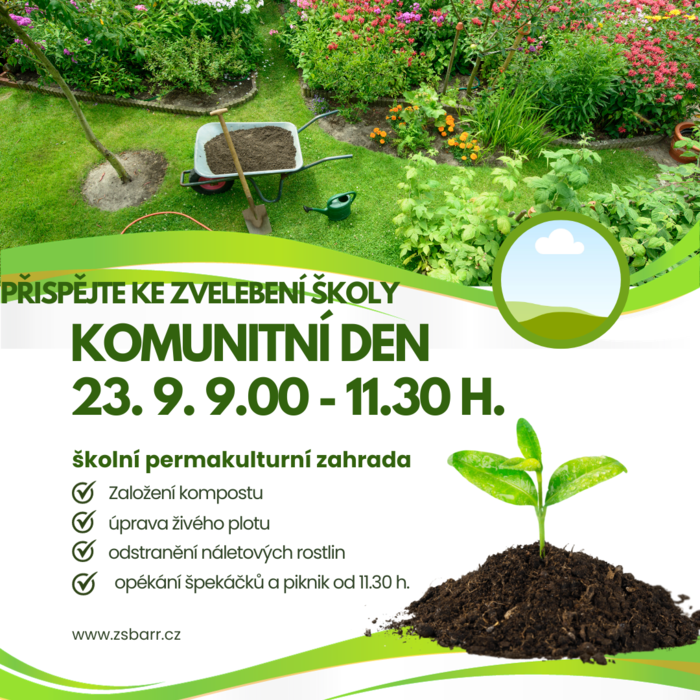 vedle budovy Sparta Praha, pod tzv. zelenou konstrukcí se nám hromadí bioodpad. V rámci projektu Cirkulární ekonomiky jsme získali kompostér, trochu hlíny a vyvýšený záhon. Díky MČ Praha 5 jsme obdrželi finance na žlutou venkovní učebnu, která tam stále opuštěně stojí, ale ne bezúčelně. To vše je základem budoucí školní zahrady! Přijďte prosím přispět svou troškou do mlýna, třebaže se necítíte jako profesionální zahradníci. Budete-li mít nářadí, zajásáme. Pokud ne, něco pro vás najdeme. Jen pracovní rukavice prosím s sebou. Po dobré práci přichází odměna - na zahradě MŠ malý piknik či špekáčky (přineste si s sebou) . Pobudeme, zasmějeme se, popovídáme.