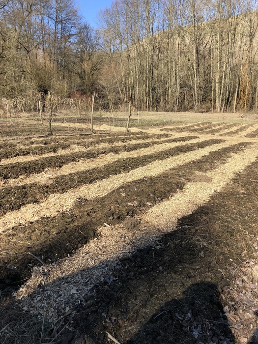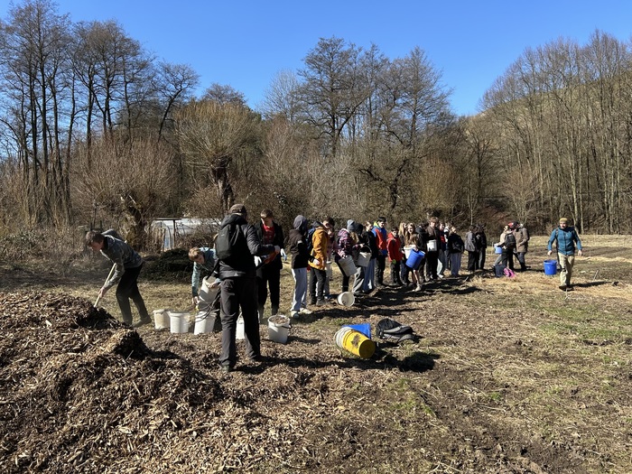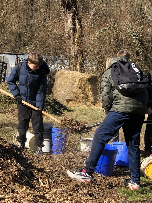Na řadu přišly i praktické zkušenosti. Vyzkoušeli jsme si různé farmářské činnosti v reálném prostředí, například překopávku nebo mulčování cest u záhonků.
