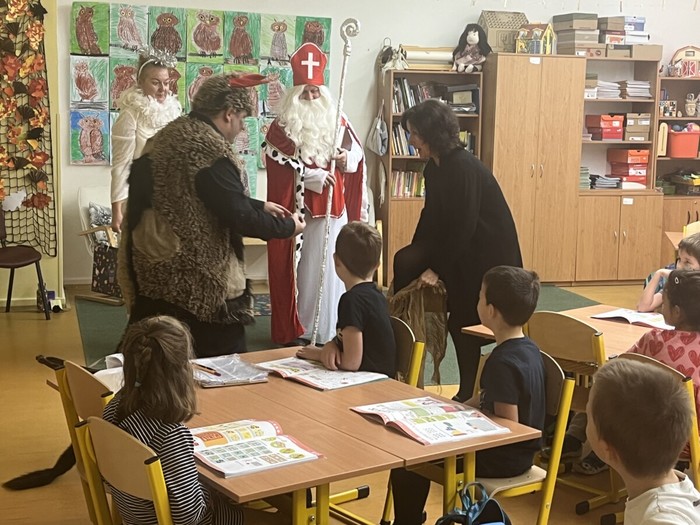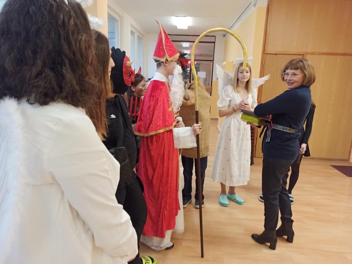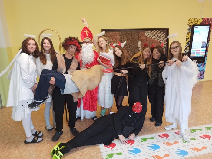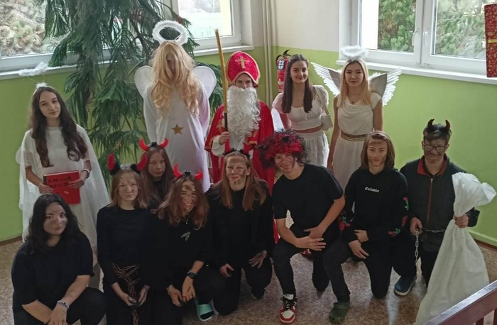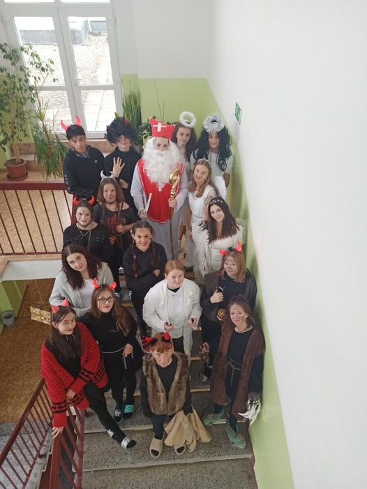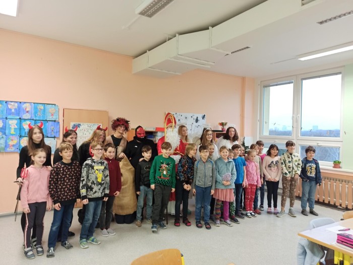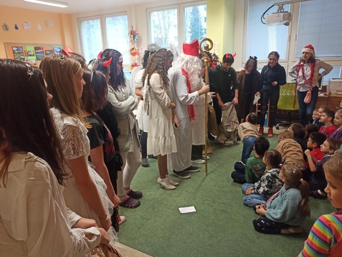5. prosince se to vždycky hemží Mikuláši, čerty a anděly. Do naší školy také dorazili. Mikuláš s hodnějším čertem přišli do prvních a druhých tříd. Sice rozdávali kromě pamlsků a ovoce také z pekla připálené perníky, ale to jen zlobivějším dětem. Také tři skupiny deváťáků vyrazily do třetích a čtvrtých tříd na prvním stupni a mezi své spolužáky na stupni druhém. V kostýmech Mikuláše, andělů a čertů, které si připravili sami žáci, zjišťovali, kdo byl tento rok hodný. Ve většině tříd si vyslechli nacvičenou písničku či básničku a za odměnu rozdali dětem jablka. Mikuláš odpoledne navštívil i školní družinu, kde děti obdržely malou sladkost. Všechny děti slíbily, že budou hodné. Nezbývá tedy než doufat, že Kniha hříšníku zůstane příští rok prázdná. Děkujeme všem, kteří se na tomto předvánočním dni podíleli.