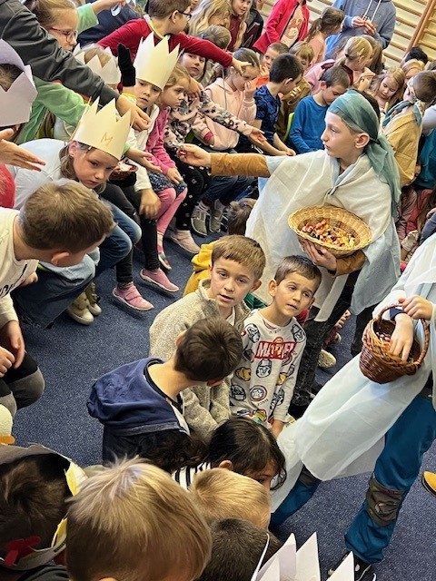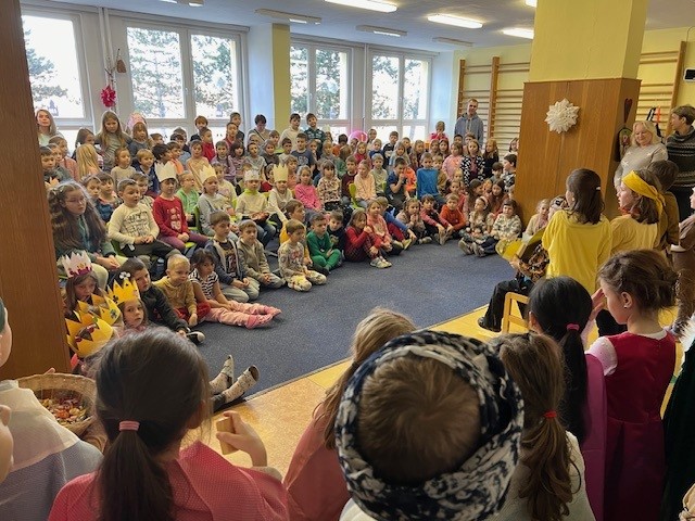S koncem doby vánoční jsme v Tříkrálovém průvodu v tradičních kostýmech, s hudebními nástroji a našimi „dary“ přišli popřát zdraví, štěstí a vše dobré v novém roce 2024 dětem i dospělým. V přízemním prostoru ŠD jsme potěšili krátkým programem naše nejmladší kamarády a společně si zazpívali vánoční koledy a písně.
