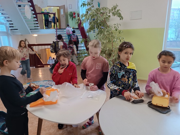 Na úvod i závěr týdne se uskutečnila společná snídaně. Ve společných prostorách školy byly připraveny stoly, kde si děti před vyučováním mohly rozložit svou snídani a společně se najíst. Velmi si vážím těch, kteří přinesli i něco navíc a byli ochotni se podělit s ostatními. Šlo o důležitý moment sdíleného času a posilování vzájemných vztahů.