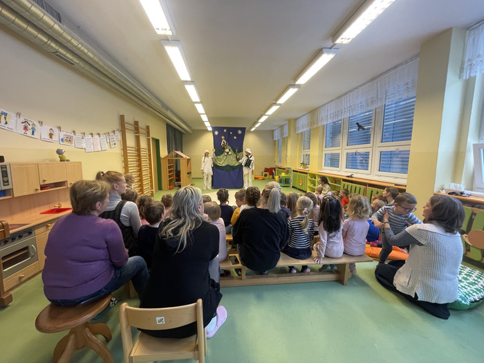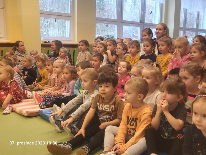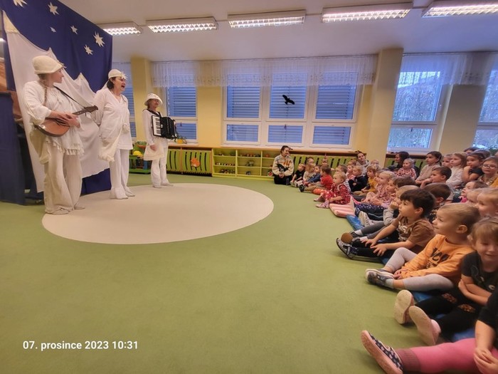 7.12. nás navštívilo dovadlo KRAB a se svou pohádkou „Vánoční příběh“ nás vzalo na cestu do Betléma, abychom společně zjistili, jak to bylo s narozením Ježíška. Celé představení bylo proložené známými vánočními koledami, které jsem si mohli s herci společně zazpívat. Všechny děti si představení i společné zpívání moc užily.
