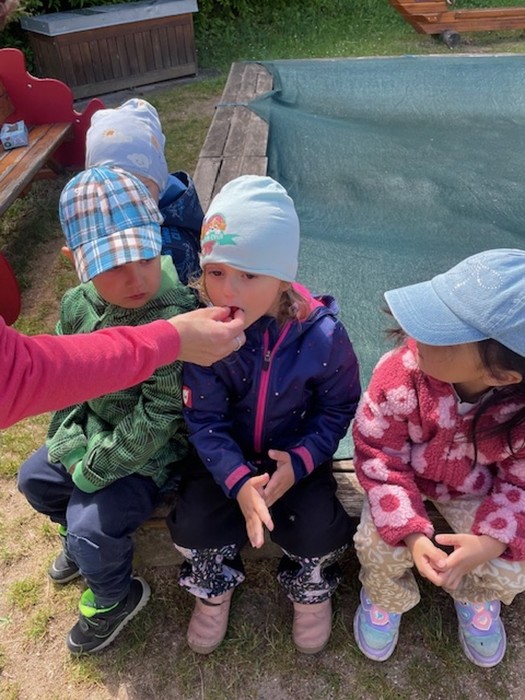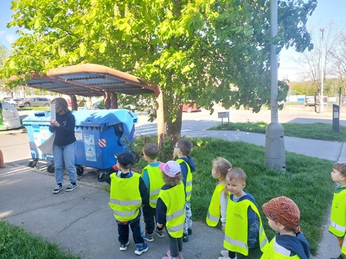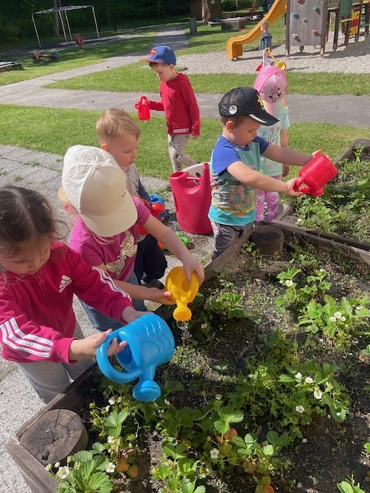 Dále jsme se v květnu věnovali práci na zahrádce, pečovali jsme o jahody. Také jsme již konečně mohli na písek. Pokud to šlo, pracovali jsme venku (malovali, cvičili, apod). Hodně jsme také chodili na procházky a výlety do lesa. Na vycházkách jsme nejen pozorovali vše okolo nás, ale stihli jsme si také procvičit třídění odpadu.