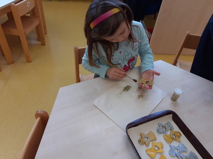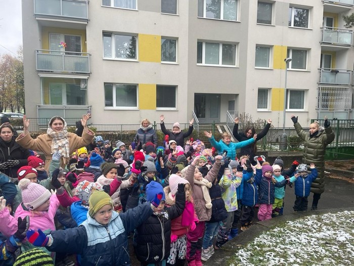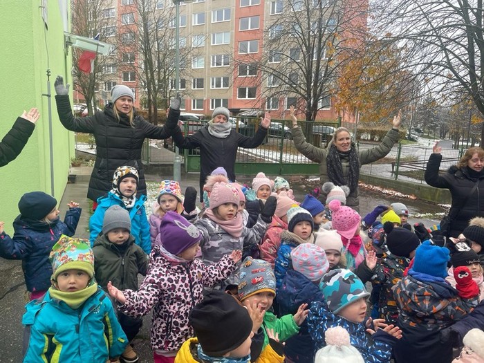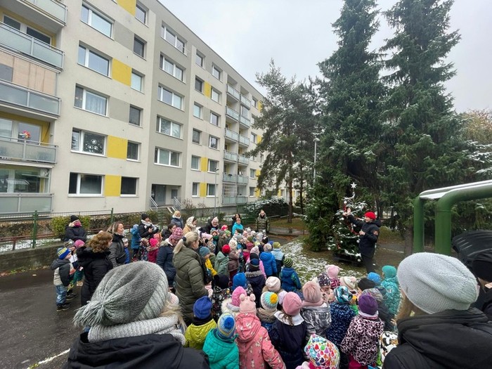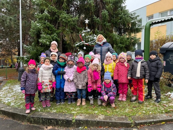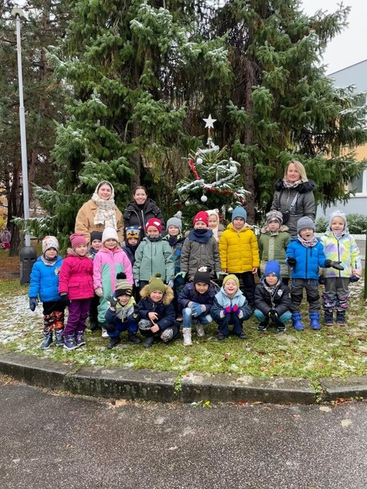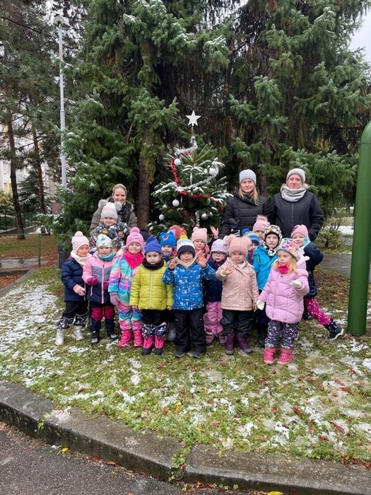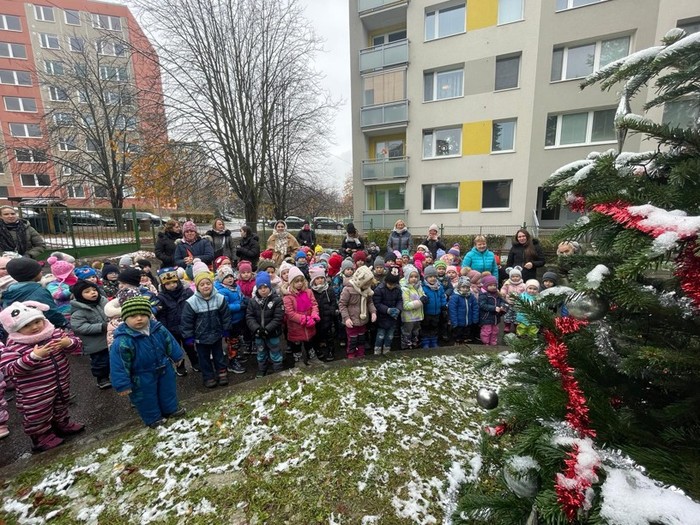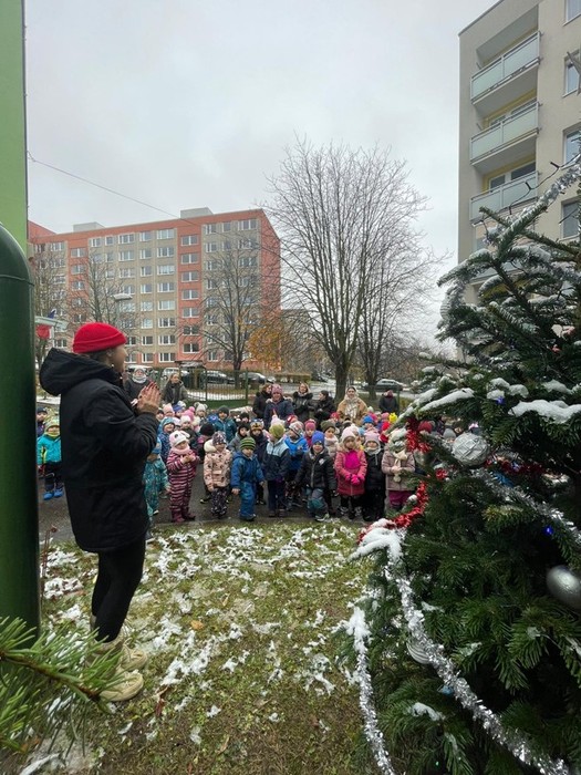 Dopoledne se všechny děti z celé školky sešly u stromečku na zahradě a společně si zazpívaly vánoční koledu. Odměnou byl krásně ozdobený a rozsvícený stromeček.