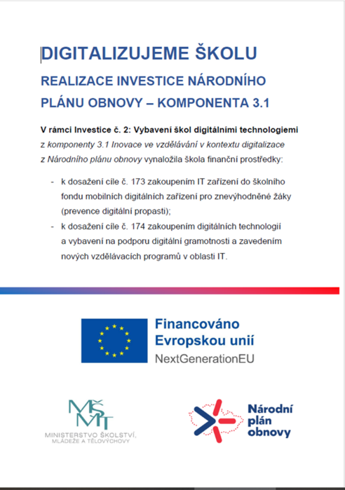 Digitalizujeme školu Národního plánu obnovy - vybavili jsme školu notebooky pro učitele, zajistili digitální pomůcky pro znevýhodněné žáky a zpřístupnili jim notebooky pro vzdělávání.